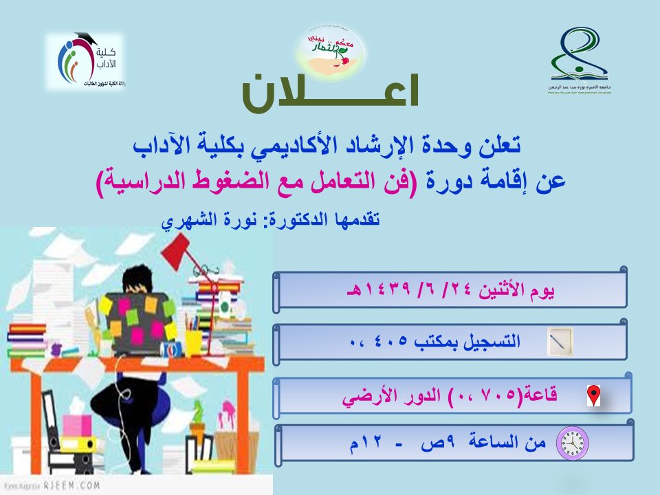 جامعة الأميرة نورة Twitterissa إعلان من كلية الآداب عن دورة بعنوان فن التعامل مع الضغوط الدراسية يوم الاثنين الموافق ٢٤ ٦ ١٤٣٩هـ جامعة الأميرة نورة Pnu Https T Co Kz6psjspaa